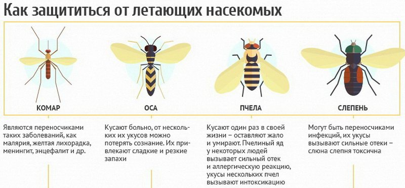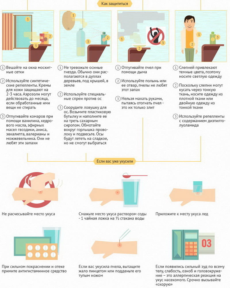 Les piqûres de moustiques, les piqûres d'abeilles, les guêpes, les moustiques, les moucherons sont très douloureuses. Le site de la morsure gonfle généralement, devient rouge et parfois des démangeaisons sévères. Certains enfants réagissent aux piqûres d'abeilles avec une forte allergie, qui se manifeste par un gonflement des voies respiratoires. Si l'enfant commence à respirer fortement, appelez immédiatement une ambulance.