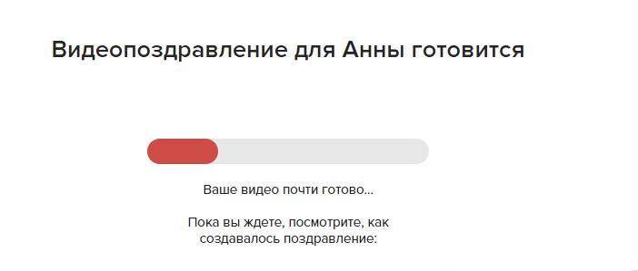 Un film entièrement terminé s'est avéré après 15 minutes. Vous pouvez immédiatement le télécharger sur FullHD, puis l'afficher même sur le téléphone, au moins sur la tablette, au moins sur l'ordinateur. Vous pouvez le jeter sur un lecteur flash ou graver sur disque. La félicitation dure 9 minutes. Si vous commandez des félicitations à des amis adultes, vous pouvez supprimer le lien vers la vidéo.