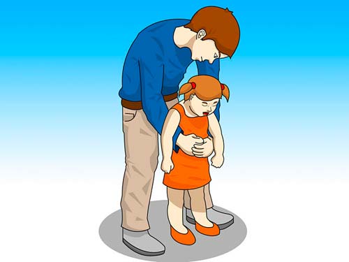 - nous écartons les coudes sur les côtés et appuyons sur le ventre de l'enfant dans le sens du bas vers le haut.