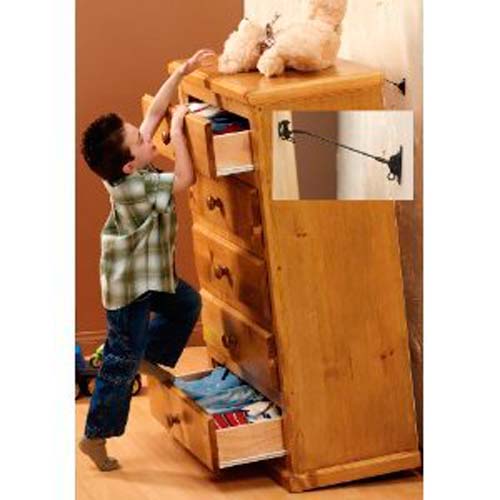 Les commodes, ainsi de suite, les grands piédestaux sont dangereux car un enfant, tout en entraînant ses capacités d'escalade, peut les renverser. Ces meubles doivent être protégés contre la chute par des sangles spéciales qui sont solidement fixées au mur et à l'arrière du mobilier. (Anti-tip (environ 950 roubles), Mommy’s Helper (environ 550 roubles)).
