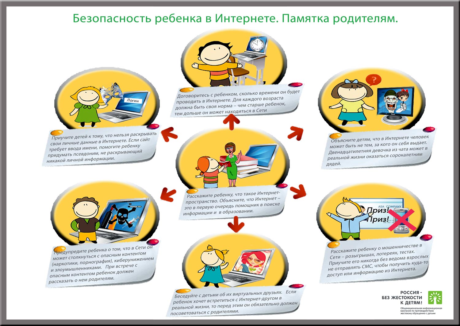 Apprenez à votre enfant à ne pas communiquer de données sur lui sur Internet, à ne pas vous enregistrer à chaque étape, à ne pas faire de vraies connaissances sans la présence de parents, et si un ami sur Internet propose d'échanger des numéros de téléphone - répondez: «Maintenant, je vais demander à ma mère la permission». Après tout, un agresseur a peur de l'attention des parents. Un enfant protégé ne convient pas du tout au rôle de victime.