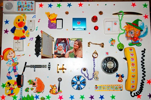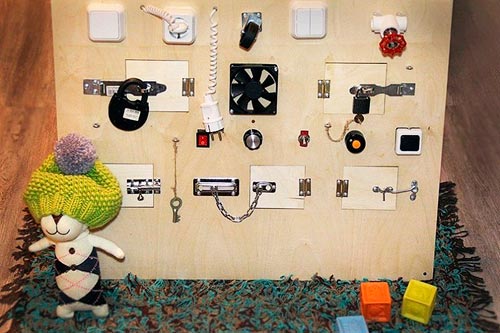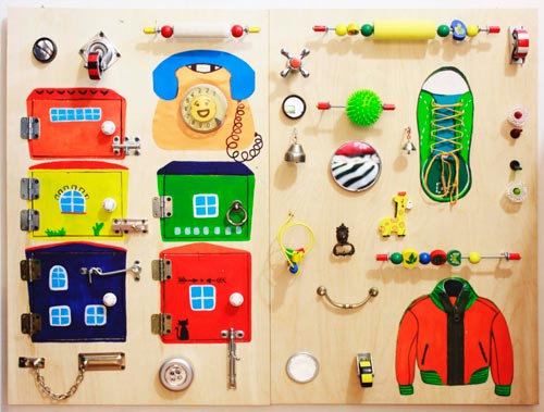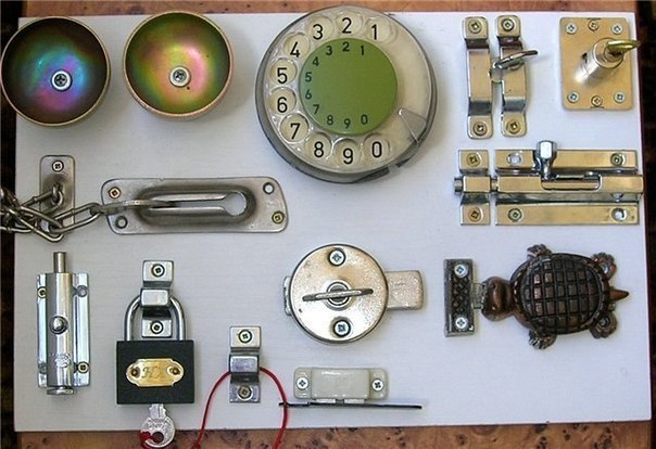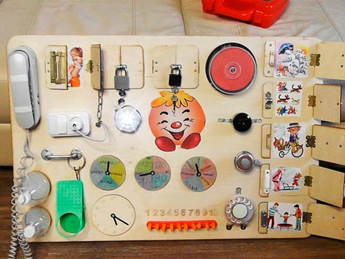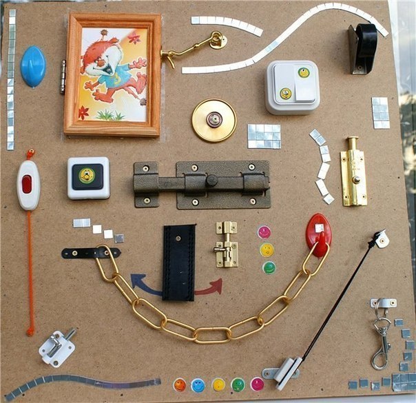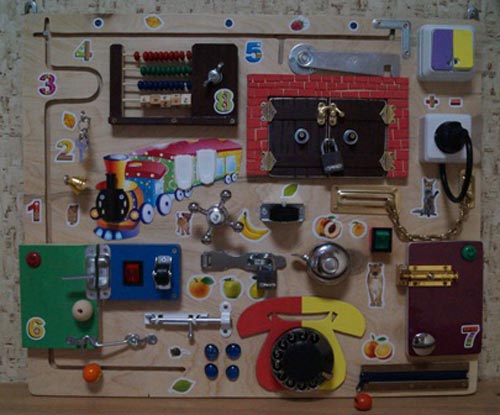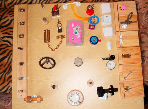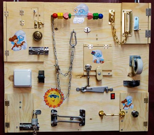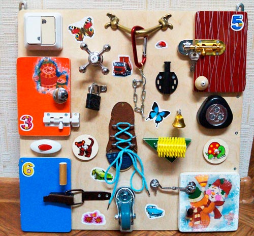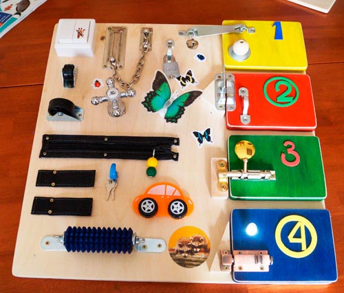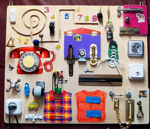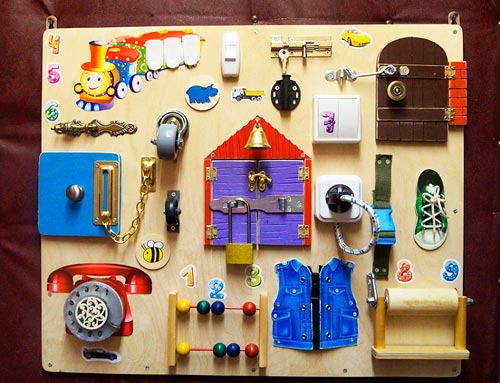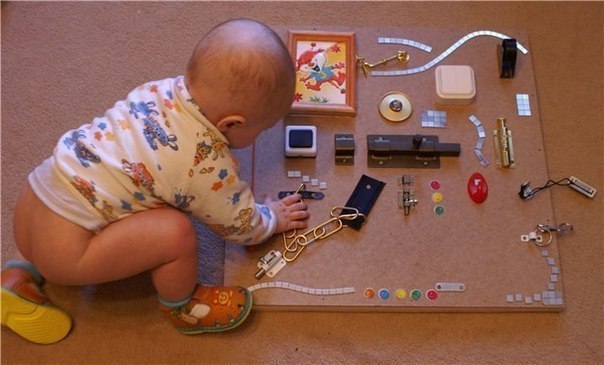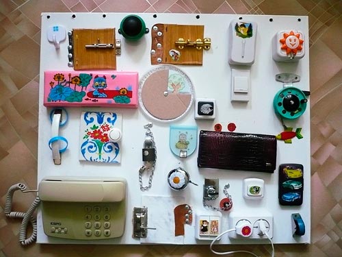 Vous pouvez créer un tableau de développement de vos propres mains ou en acheter un fini. En fait, c'est une planche ordinaire, avec ces choses très dangereuses fixées, dont les parents tremblaient. Par exemple, il peut s'agir d'une prise cassée avec une fiche, un interrupteur, des poignées de portes d'armoire ou un crochet sur une porte, un laçage, un bouton de sonnette et même un cadran circulaire d'un ancien téléphone, c'est-à-dire cela peut être tout ce que vous pouvez toucher, bouger, étudier sans aucune menace pour la vie. En attendant, l'enfant est occupé par une affaire aussi grave, maman peut aussi se donner 10-15 minutes de temps libre 🙂