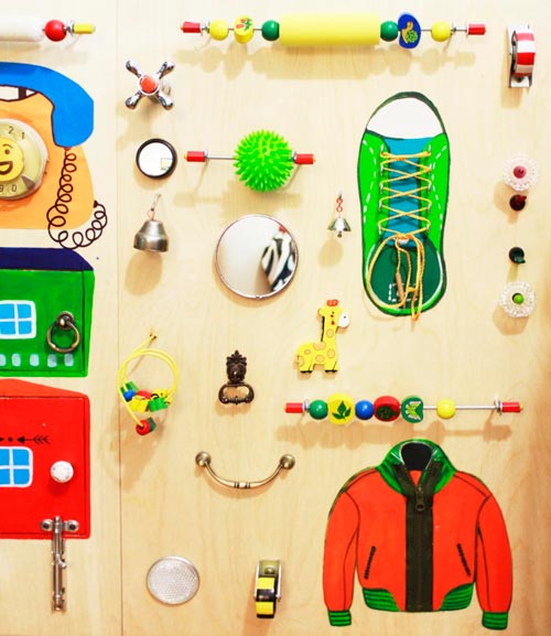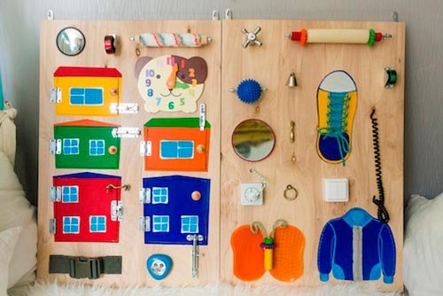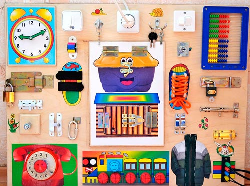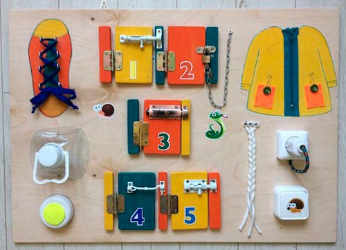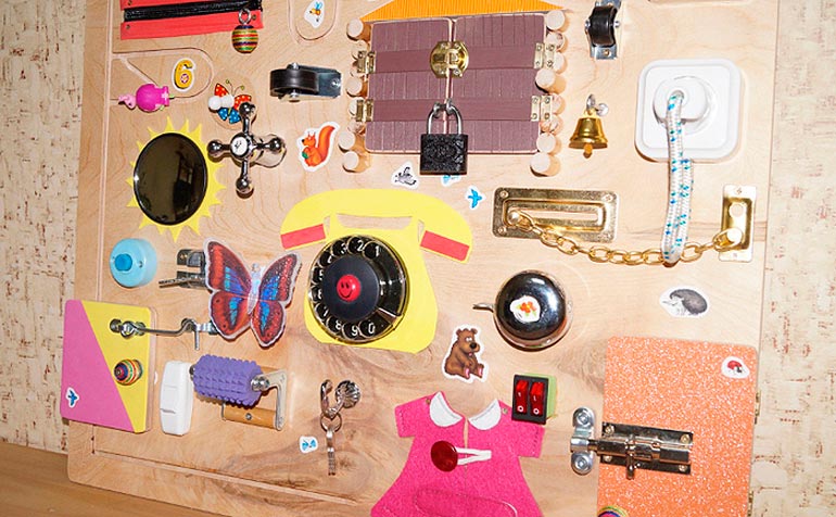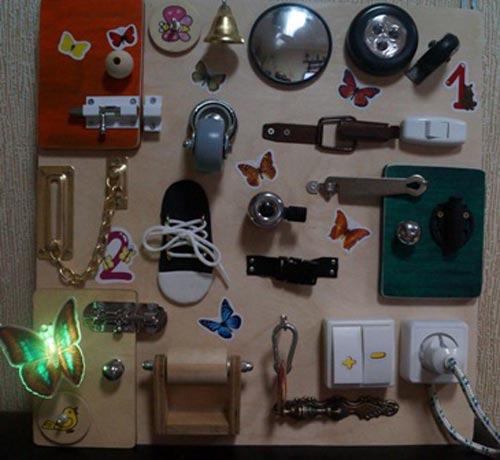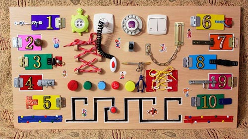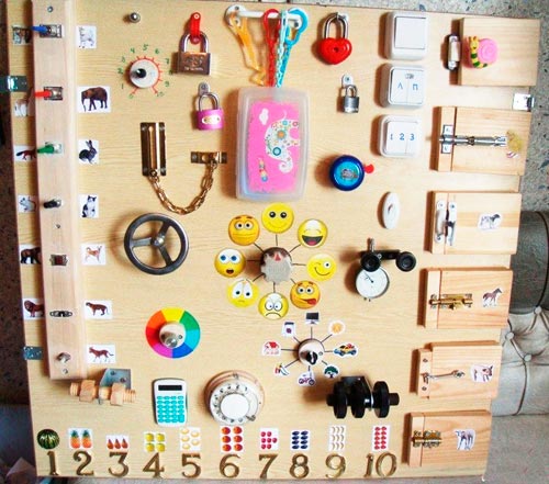 Vous avez donc décidé de créer vous-même un tableau de développement et réfléchissez maintenant à la meilleure façon de le faire. Vous devez d'abord choisir la base. En règle générale, pour cela, ils prennent un petit morceau de contreplaqué, de plastique ou de panneaux de particules stratifiés. Une planche ordinaire sera trop lourde et une planche non laminée peut apporter un tas d'éclaboussures au lieu d'être bonne pour votre fils ou votre fille. Comme inserts supplémentaires, utilisez de petites planches, le même contreplaqué ou des morceaux de stratifié. Parfois, un carton ondulé épais est utilisé comme base pour un lifeboard. Il sera pratique si vous décidez de faire découvrir à votre enfant le monde des tissus et des accessoires de couture.