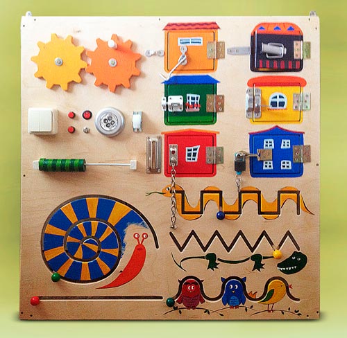 Notre bébé est très agité et difficile à prendre pendant longtemps. Mais les nouveaux jouets l'intéressent toujours, mais pas pour longtemps. Nous avons décidé d'essayer de lui créer une telle planche. L'invention prend vraiment vraiment notre enfant pendant longtemps, car elle utilise beaucoup de détails intéressants et lumineux.