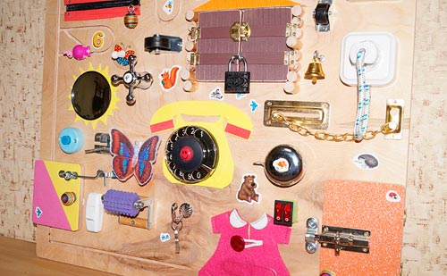 Mieux encore, si les éléments de divers matériaux seront attachés à la planche - tissu, métal, plastique, caoutchouc. Cela diversifie l'éventail des sensations et n'a pas le temps de se lasser du bébé. Les pièces les plus utilisées sont:
