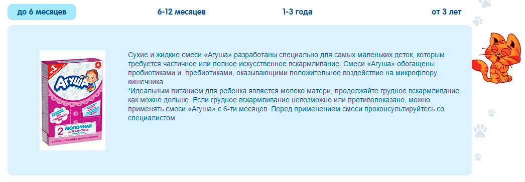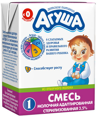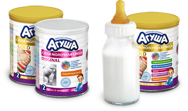 "Agusha" propose deux gammes de préparations pour nourrissons, en fonction de l'âge de l'enfant. Les produits pour bébés jusqu'à six mois portent le numéro 1 sur l'emballage, les aliments pour bébés de plus de cet âge sont marqués du numéro 2. Pour les deux catégories d'âge, des substituts liquides et secs du lait maternel sont produits.