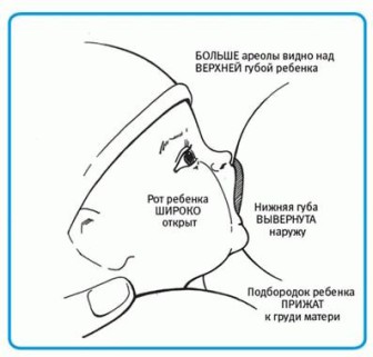 Le nouveau-né doit être placé près de la poitrine. Il devrait toucher le bas de son menton, mais toujours être capable d'ouvrir la bouche suffisamment pour saisir le mamelon avec l'aréole. Si le bébé touche le bas du mamelon avec la lèvre inférieure, retirez-le soigneusement de la poitrine, inclinez la tête en arrière et attachez-le à nouveau. C'est la meilleure position pour l'alimentation, dans laquelle la femme ne ressent pas de douleur.