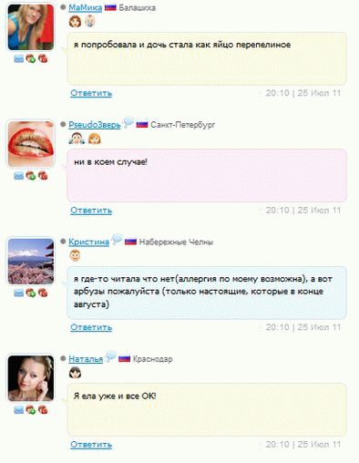 J'ai essayé le melon quand ma fille avait 4 mois, le premier jour 1 pièce, je n'ai remarqué aucune réaction négative, donc le deuxième jour je me suis permis plus. Bien que, il me semble, l'essentiel dans toute affaire est de connaître la mesure.