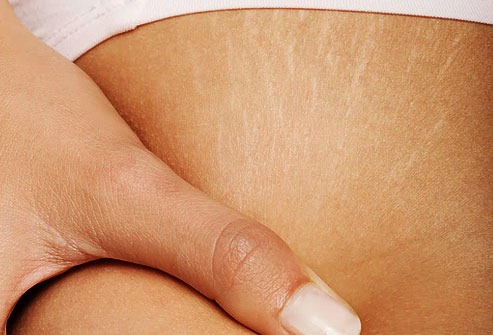 L'étirement rapide de la peau conduit au fait qu'avec un manque d'élasticité, des déchirures se produisent dans la couche profonde de la peau. Cela conduit à l'apparition de vergetures, qui ont d'abord une couleur bordeaux, et après que les stries sont envahies de tissu conjonctif, elles sont rose pâle (plus claires que la peau environnante).