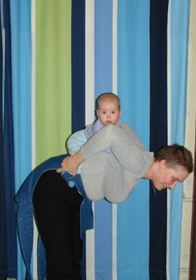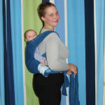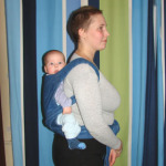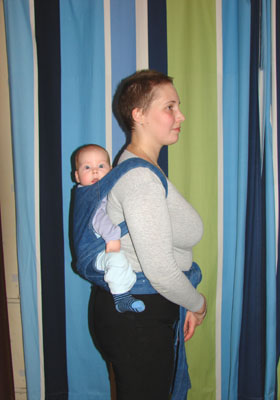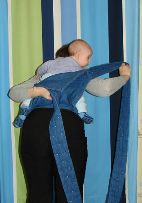 Déplacez maintenant les anneaux un peu en arrière. Nous prenons le bébé et le mettons sur notre épaule libre, tandis que ses jambes doivent être enfilées dans le harnais comme indiqué sur la photo ci-dessous.