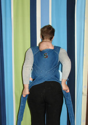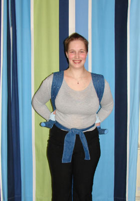 Lorsque les deux sangles supérieures du May-Sling sont devant, vous pouvez les redresser et bien les tirer.