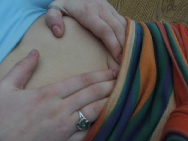- Nous plaçons nos mains sous une large bande aussi profonde que possible, «déplions» l'estomac dans une «poche» sur un ruban étroit. Levez-vous soigneusement.