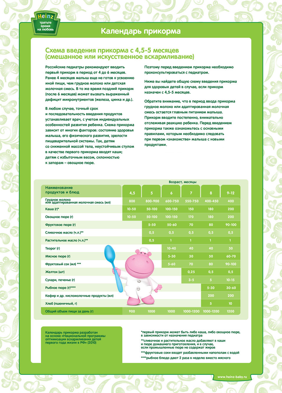 A partir de 6 mois, des aliments complémentaires sont introduits progressivement, sans arrêter l'allaitement. De nouveaux produits sont donnés en petites portions, habituant et adaptant ainsi le tractus gastro-intestinal de l'enfant au menu adulte. À partir de 6 mois, le bébé est transféré à 5 repas avec un intervalle de 4 heures.