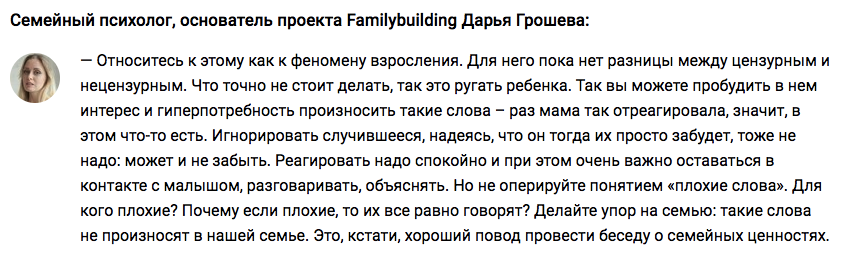 Felina:Haha, et moi aussi, j'ai juré des obscénités dans l'enfance)) juste à cet âge (4 ans). Heureusement, je suis loin du premier enfant, mes parents l'ont déjà dépassé. Ces mots ont été ignorés de manière si dédaigneuse que je suis rapidement devenu sans intérêt. Après tout, je ne comprenais pas le sens, c'était comme dire quelque chose en chinois.Je ne le comprends pas moi-même et d’autres ont fait semblant de ne pas comprendre. J'ai répété plusieurs fois et j'ai réussi. J'ai oublié ces phrases jusqu'à l'adolescence))