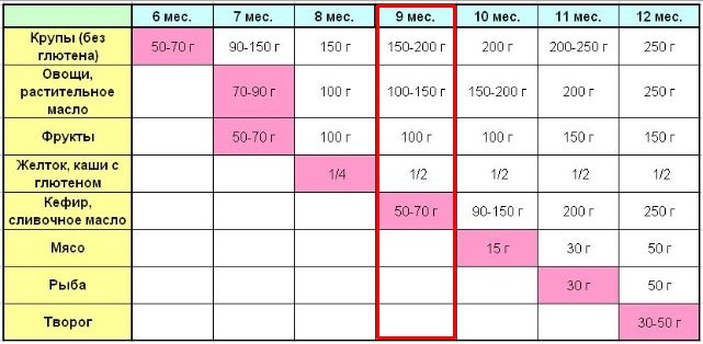Sachant que le régime alimentaire d'un enfant de 9 mois comprend cinq tétées et que la quantité quotidienne de nourriture consommée (hors boisson) doit être d'au moins un litre, il est facile de calculer que pour une tétée, il devrait recevoir au moins 200 ml de produits destinés aux aliments pour bébés. .