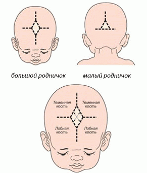 Une grande fontanelle en forme de losange mesurant 2 sur 2 centimètres est située directement au milieu de la couronne de la tête, ou, comme d'habitude, disent-ils - sur le dessus de la tête.
