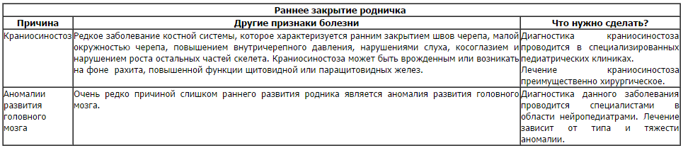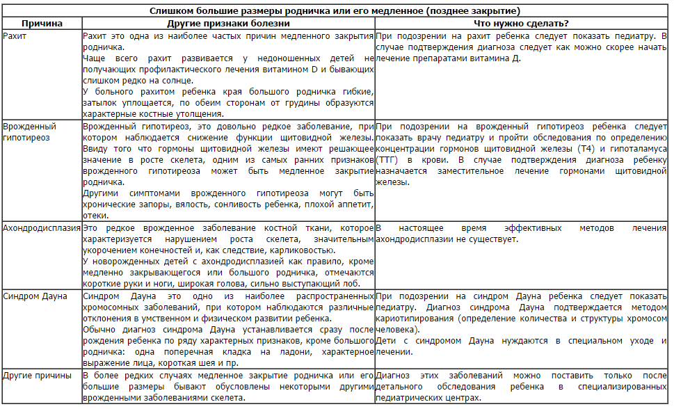 - Rachitisme. Cette maladie est presque la cause la plus fréquente de fermeture tardive de la fontanelle. En règle générale, cela se produit chez les nourrissons prématurés, rarement au soleil, ayant un manque de calcium et de vitamine D. Lire l'article sur le rachitisme >>>;