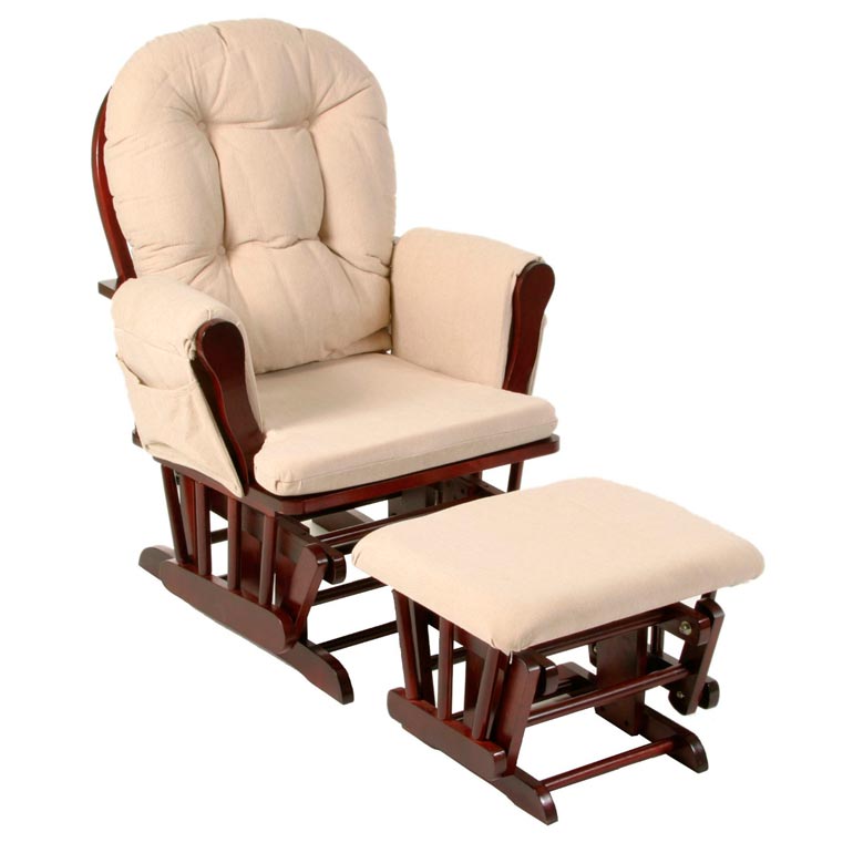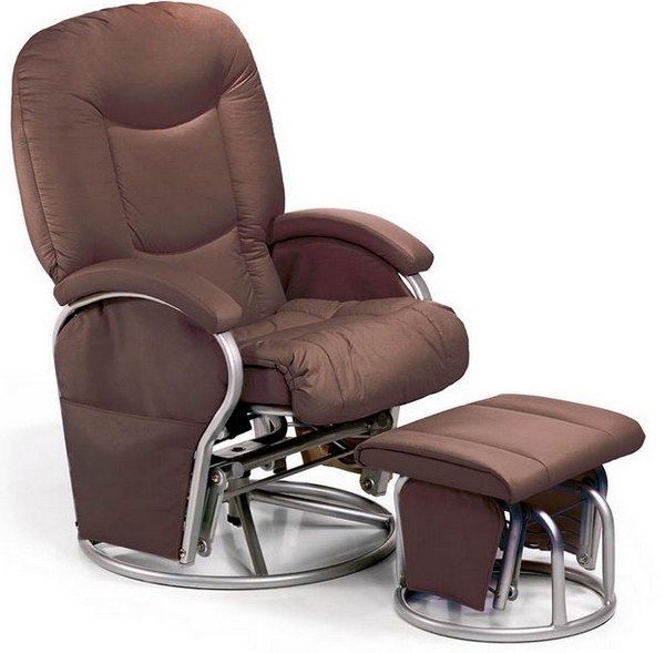 - Planeurs. Les planeurs équipés d'un mécanisme à pendule sont populaires. Les cadres sont en bois, en métal. Ils sont résistants aux fortes contraintes mécaniques, peuvent facilement supporter un poids allant jusqu'à 150 kg. Le pendule offre une oscillation à un rythme très agréable, tandis que les mouvements ressemblent à de la planification. Les accoudoirs sont hauts, les dossiers sont particulièrement ergonomiques. Souvent, les modèles ont des appuie-tête. Il est intéressant de noter que les poufs fournis dans le kit sont également équipés d'un mécanisme oscillant pendulaire. Le tronc et les jambes se balancent simultanément. Vous pouvez facilement arrêter la balançoire en utilisant le bouchon. Vous pouvez régler le niveau du dossier, pousser le siège. C'est super qu'une papille ou une petite bouteille, un hochet puisse être mis directement dans la poche située dans l'accoudoir. S'asseoir sur de telles chaises est non seulement pratique, mais également utile, car la charge principale est retirée de la colonne vertébrale. C'est formidable que les fabricants surveillent spécifiquement les matériaux. Ils sont faciles à nettoyer, repoussent la poussière. Les revêtements sont doux et confortables.