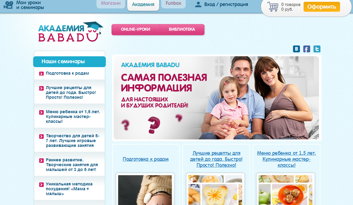 Une mention distincte est le service nécessaire pour toute jeune mère sur le site Web de Babadu - Babadu Academy. Cette section propose des leçons en ligne, une bibliothèque, des didacticiels vidéo éducatifs, des recettes pour les enfants, ainsi que de nombreux conseils pour toutes les occasions. C'est très pratique, car vous pouvez apprendre le matériel et les leçons nécessaires sans vous arrêter de parcourir les catalogues, ce qui vous fera gagner beaucoup de temps.