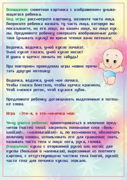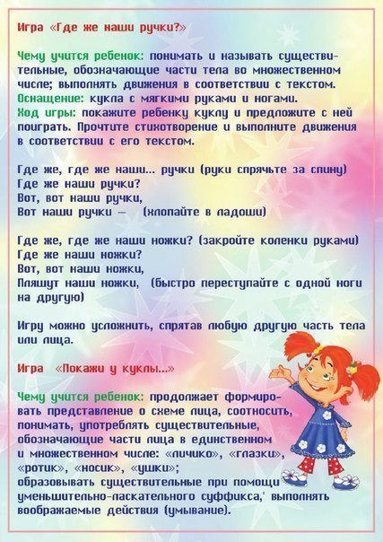 Une série de jeux didactiques pour enfants, présentée sur cette page du site, vise à étudier différentes parties du corps humain. Chaque jeu est accompagné de rimes amusantes qui expliquent comment nos parties du corps sont organisées. L'enfant apprendra à plier ses doigts, à déterminer la couleur des yeux (le jeu "Qui a ces yeux bleus?"), À apprendre les mains, les pieds, le ventre, le visage, le nez, les oreilles et peut les montrer sur une poupée (montrer le jeu "Montrer sur une poupée ...") ou doux un jouet (animal, humain). Les jeux sont très utiles pour le développement du bébé, en plus, l'enfant sera très amusant et intéressant!