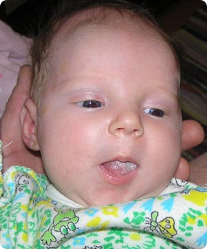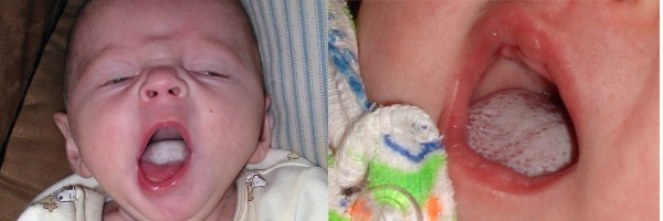En cas d'infection à levures, une couche graisseuse grossière apparaît dans la bouche de l'enfant, sous laquelle se trouvent des taches enflammées. En cas de dommages graves, les taches peuvent même saigner. Il y a une forte probabilité de pénétration à travers eux dans le corps du bébé d'une infection plus grave.