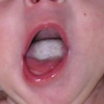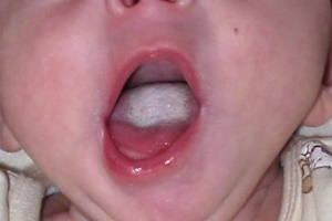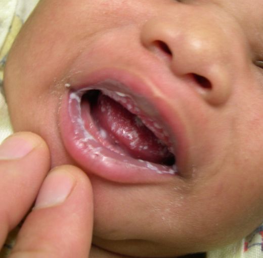 Le bébé peut être agité, capricieux, lancer des seins pendant l'allaitement ou même refuser de téter (biberons), car la succion peut le blesser. Après un certain temps, de petites taches se développent pour former de grands films légers ou un revêtement de type caillé.