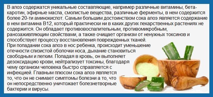 - Aloès à l'ail. Versez 1 litre d'ail dans un litre d'eau bouillie et laissez infuser 4 heures sous un couvercle bien fermé. Mélanger 1 cuillère à soupe de l'infusion avec la même quantité de miel liquide et de jus d'aloès pur et essuyer le nez du bébé jusqu'à 6 fois par jour avec un tampon imbibé d'une solution.