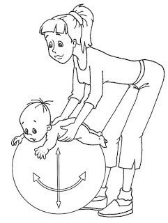 Nous avons mis le bébé sur la fitball avec son ventre vers le bas pour qu'il repose ses mains sur le ballon. Nous prenons l'enfant par les jambes comme si nous roulions une brouette et le balançons légèrement d'avant en arrière.