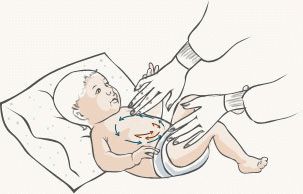 1. Tout d'abord, caressez doucement l'estomac, augmentant progressivement la pression, en passant à une légère pression. Pour ce faire, vous devez plier vos paumes avec une "maison" de sorte que la partie convexe de la "maison" se trouve dans la zone du nombril du bébé, et effectuer doucement des mouvements de pression avec les côtes des paumes le long du bord de l'abdomen. Dans ce cas, une attention particulière doit être accordée au contournement de la région de l'hypochondre droit - il y a un foie, qui chez les bébés fait légèrement saillie sous la côte inférieure. Ensuite, vous devez effectuer plusieurs mouvements pressants de droite à gauche (donc dans le corps du bébé il y a un gros intestin). Après chaque mouvement, vous devez effectuer des mouvements de caresse lents et apaisants.